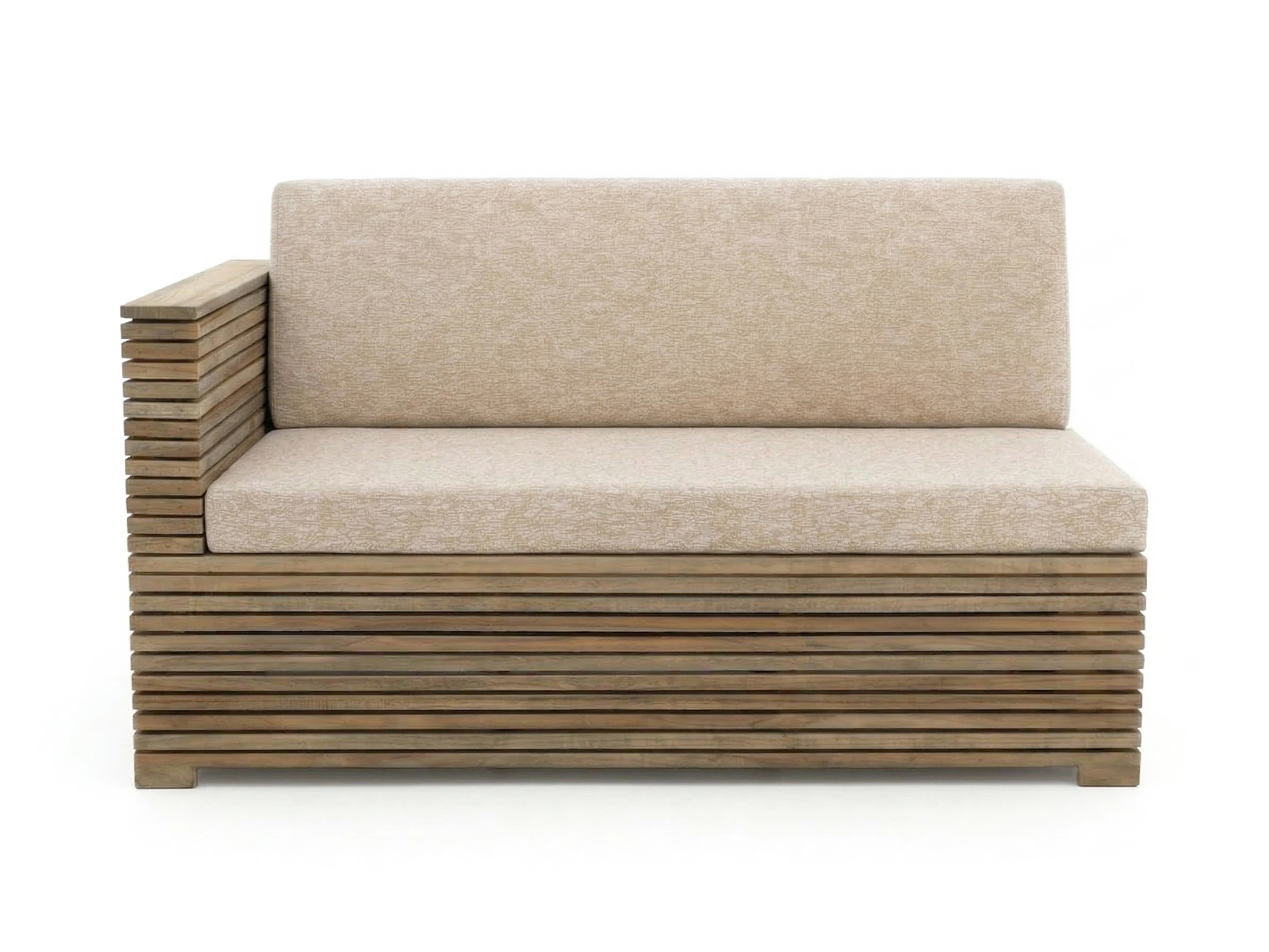 De ROUGH C loungemodule met rechterarm is een 2 persoons lounge element van teakhout, ideaal als uitbreiding van je bestaande ROUGH C loungeset of als losse loungeplek op je terras. Het sterke teakhout is gemaakt om buiten te staan en kan tegen alle weersomstandigheden, dus je hoeft je niet druk te maken bij een buitje. De kussens in beige tint worden meegeleverd, zodat je meteen kunt zitten zonder te zoeken naar passende kussens. Door de rechterarm gebruik je deze module logisch aan de rechterkant van je opstelling, of juist los tegen een muur of schutting. Handig als je net dat ene stukje extra zitplek mist, of een knusse hoek wilt maken waar je met z’n tweeën languit kunt zitten.
