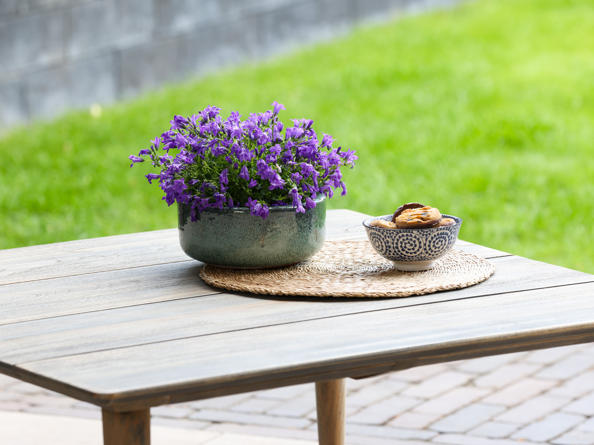 Weerbestendig teakhout: Het teakhout van deze tafel is bestand tegen alle weersomstandigheden, zodat je er het hele jaar door van kunt genieten zonder zorgen over slijtage.