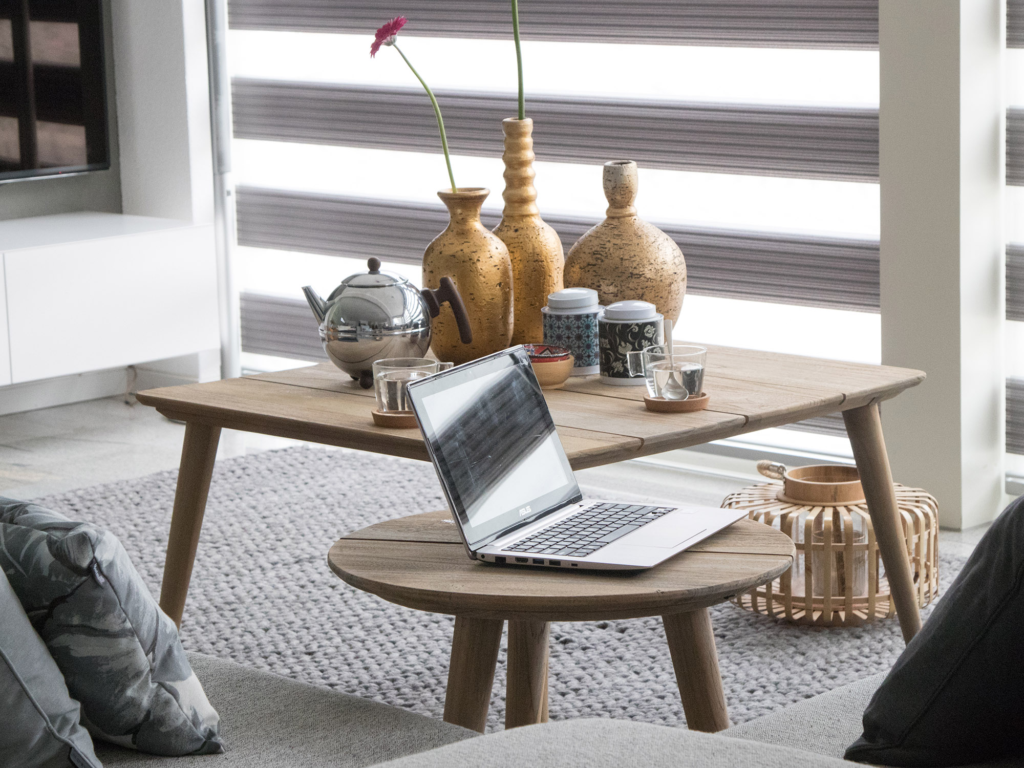 Deze tafel is vrij laag, ideaal om aan een loungeset te schuiven