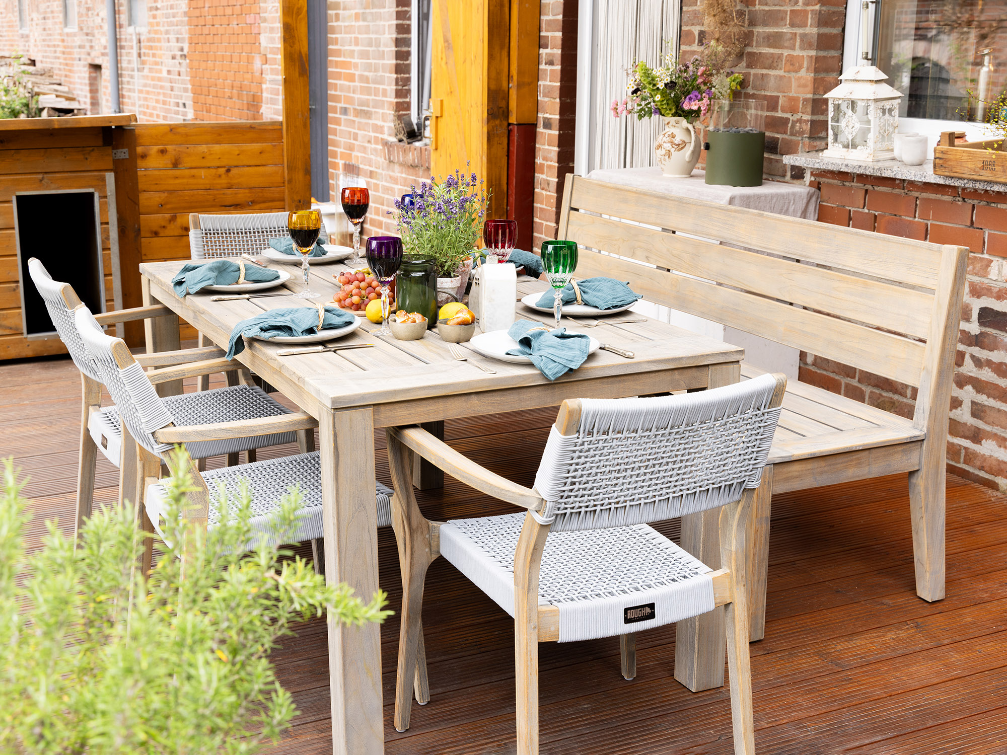 Stevig teakhouten frame: Dit duurzame hout is bestand tegen alle weersomstandigheden en zorgt voor een solide basis, zodat je jarenlang van je stoel kunt genieten.