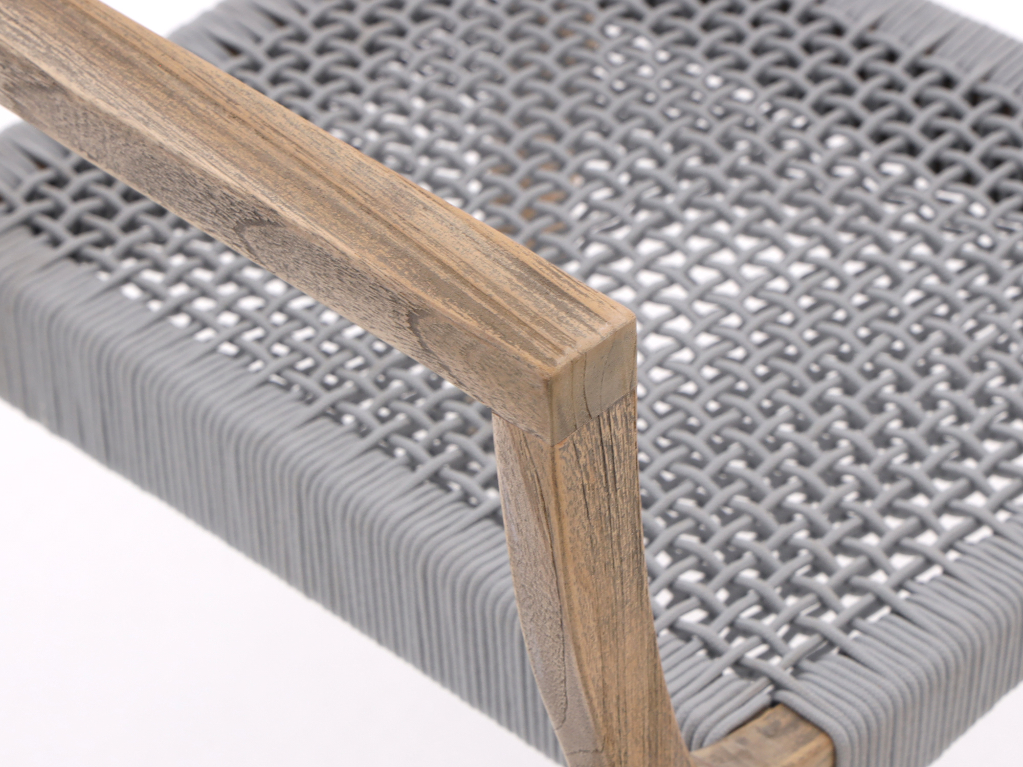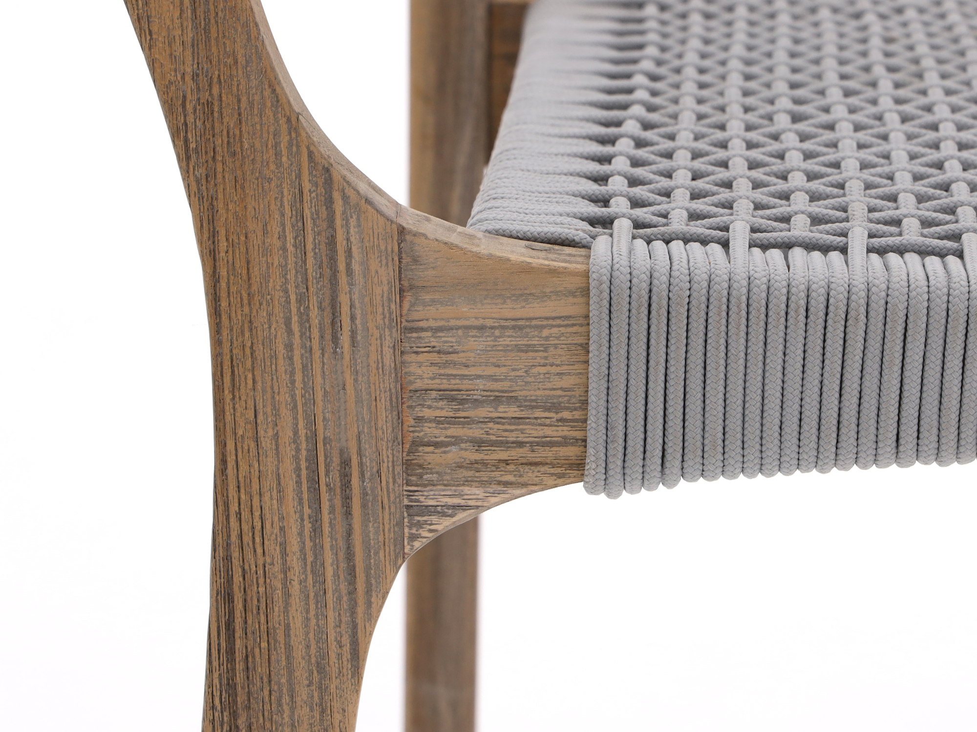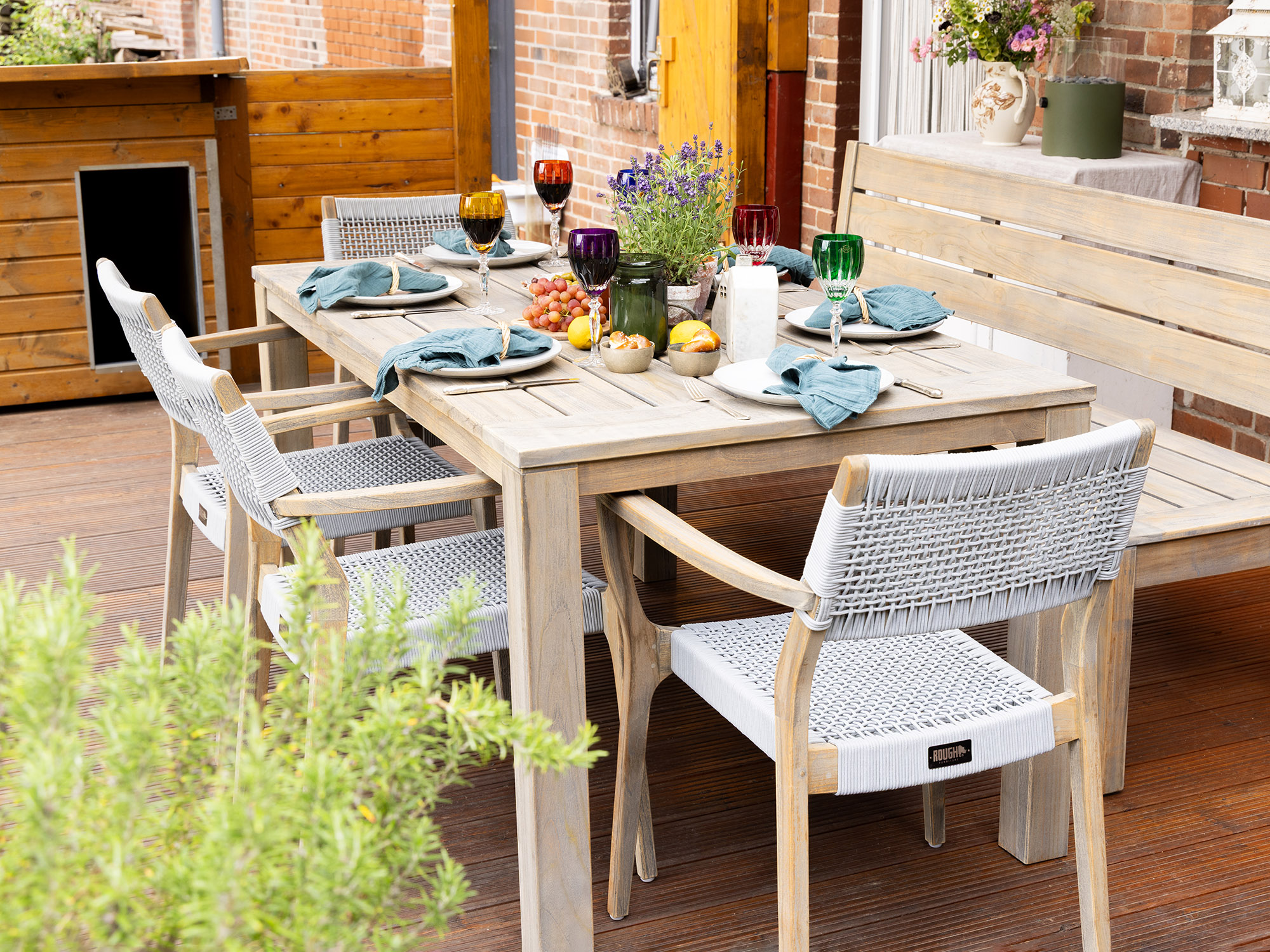 Lichtgrijs rope dat snel droogt: De zittingen van de stoelen zijn gemaakt van stevig geweven rope, dat niet alleen snel droogt, maar ook koel blijft in de zon. Ideaal voor die warme zomerdagen!
