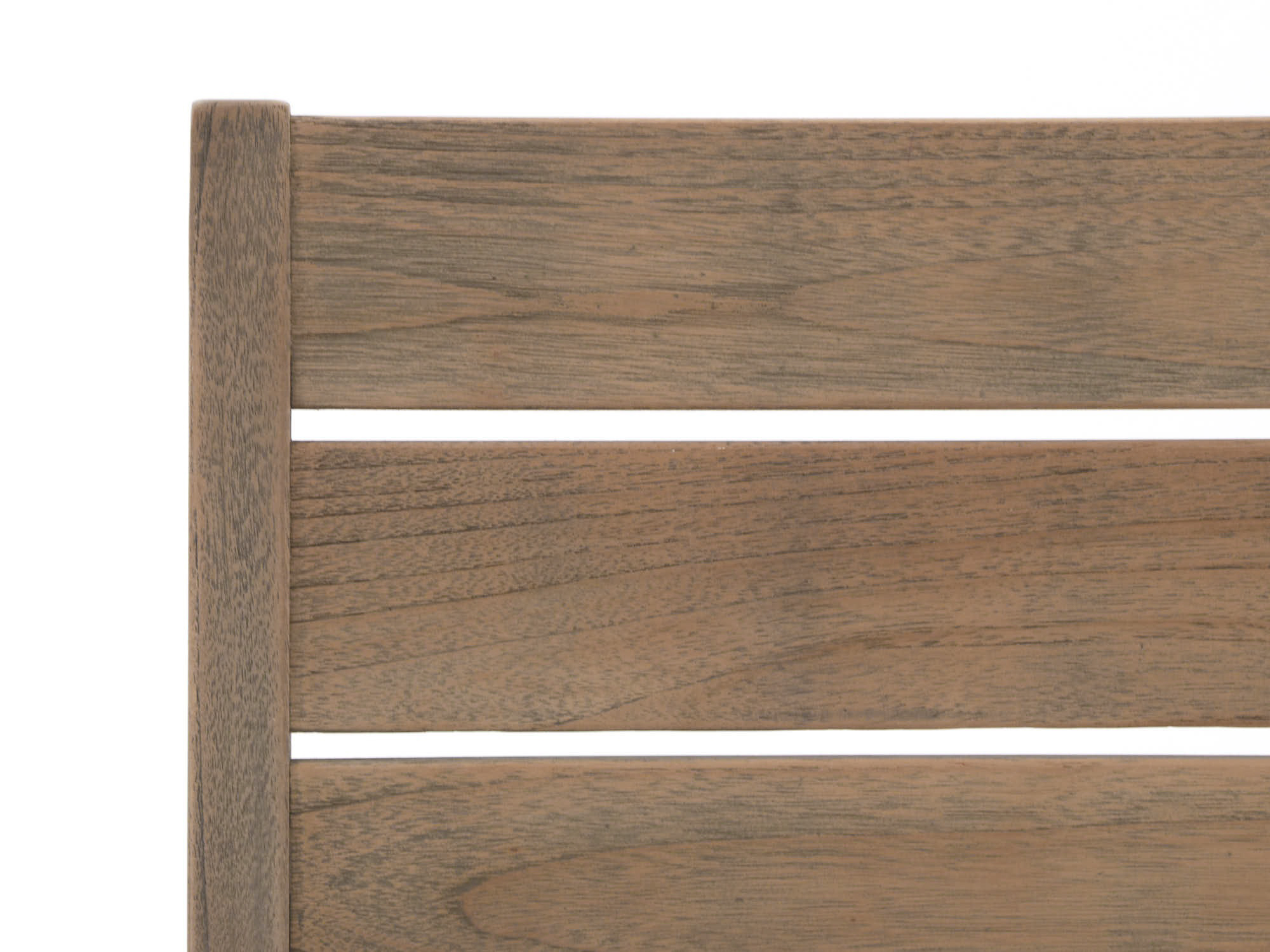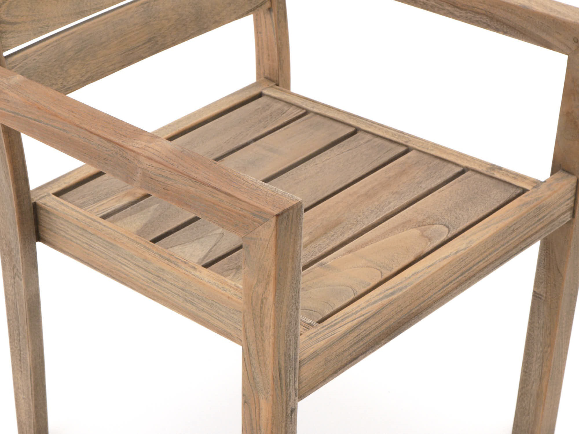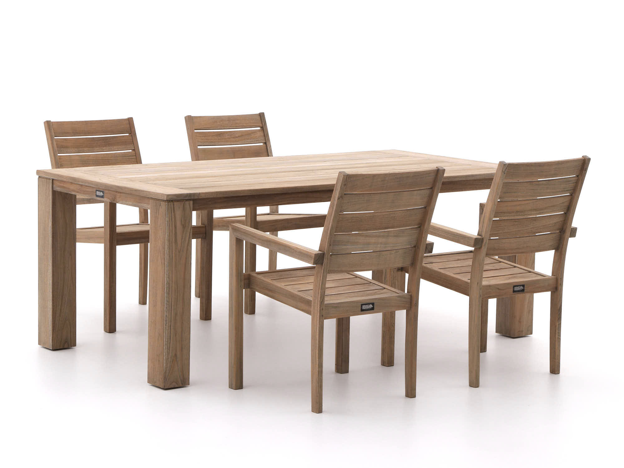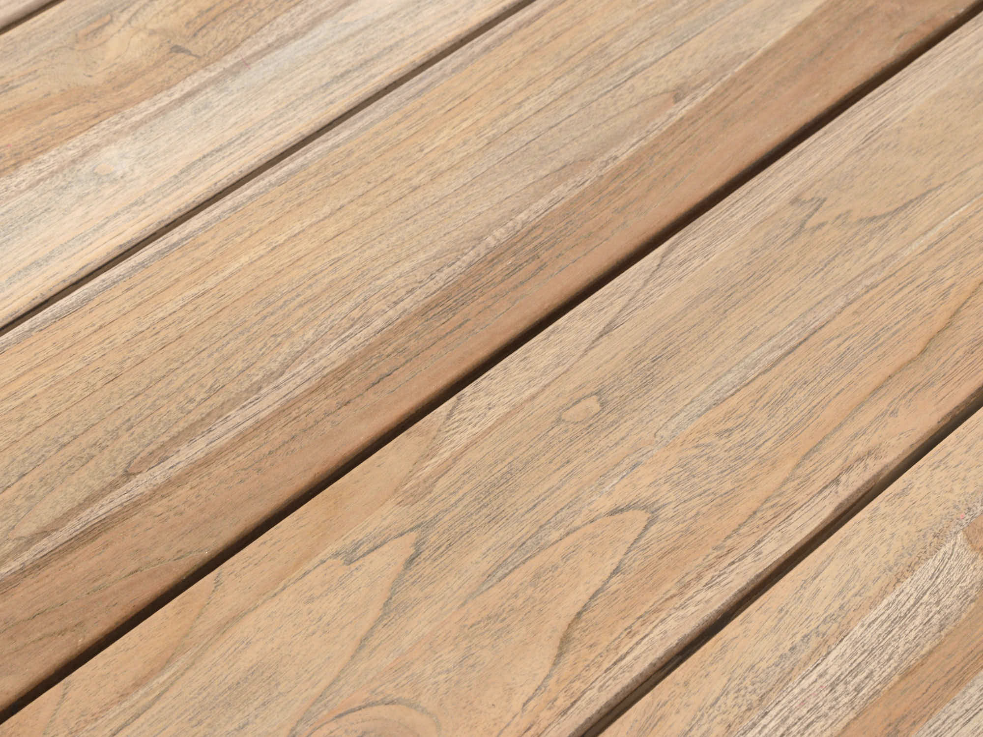 Teakhout in Old Teak Greywash: Deze set straalt een natuurlijke en tijdloze elegantie uit, terwijl het hout bestand is tegen weer en wind. Geen zorgen over regenbuien of felle zon, dit hout kan het allemaal aan.