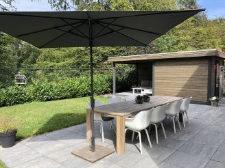 • Teakhouten tafel en stoelen: Sterk natuurproduct dat het hele jaar buiten kan staan, ideaal als je niet steeds alles wilt verslepen bij een buitje.