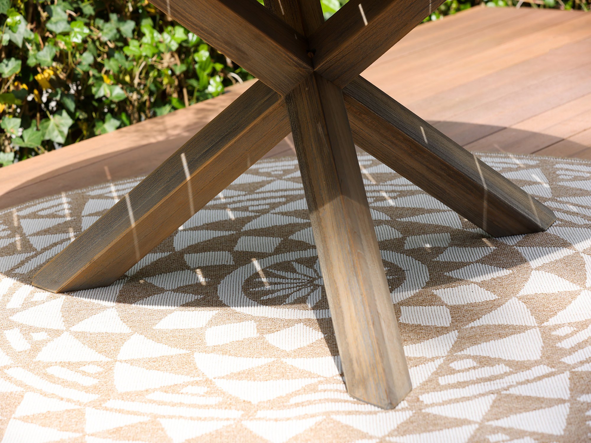 Teakhout: Het tafelblad en onderstel zijn gemaakt van teakhout, wat bekend staat om zijn weerbestendigheid. Dit betekent dat de tafel het hele jaar door buiten kan blijven staan, zonder dat je je zorgen hoeft te maken over beschadiging.