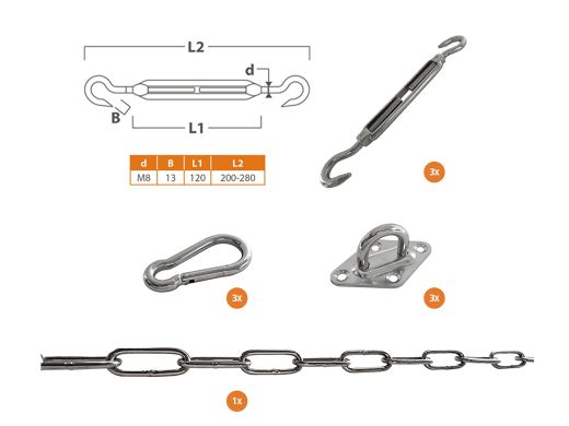 De set is uitgevoerd in RVS (RVS A4) en bevat onder andere een M8 spanner. Daarmee kun je je driehoekige schaduwdoek eenvoudig op spanning brengen en later nog bijstellen als dat nodig is. RVS is een logische keuze voor buiten: je gebruikt de set gerust bij een pergola, aan de gevel of tussen palen in de tuin. Door het doek goed strak te bevestigen, loopt regenwater makkelijker weg en blijft de vorm van je doek mooier.
