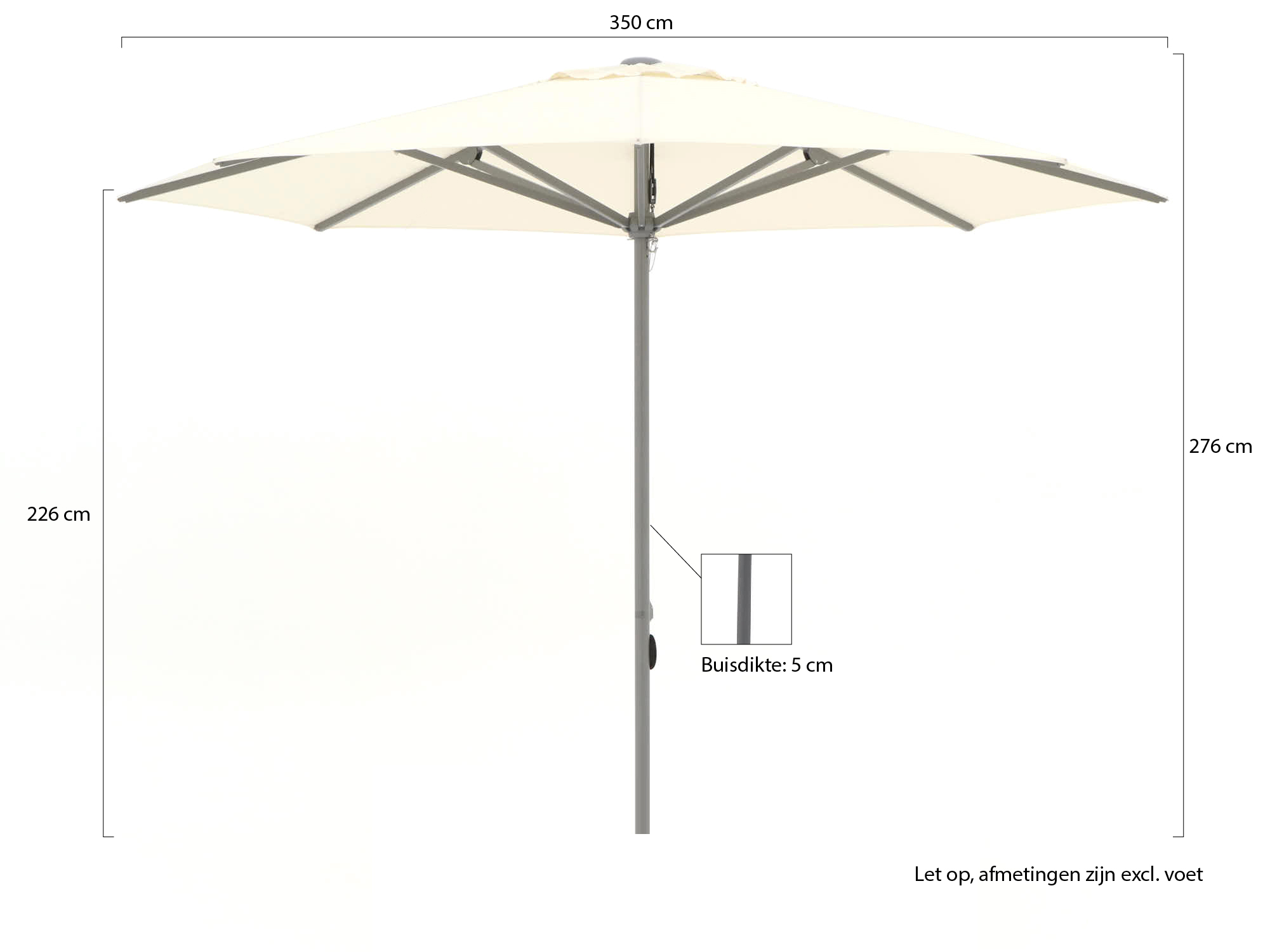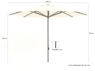 Diameter van 350 cm: Ruimte voor 6 tot 8 zitplaatsen in de schaduw, ideaal voor een ruime eettafel of een grote loungeset.