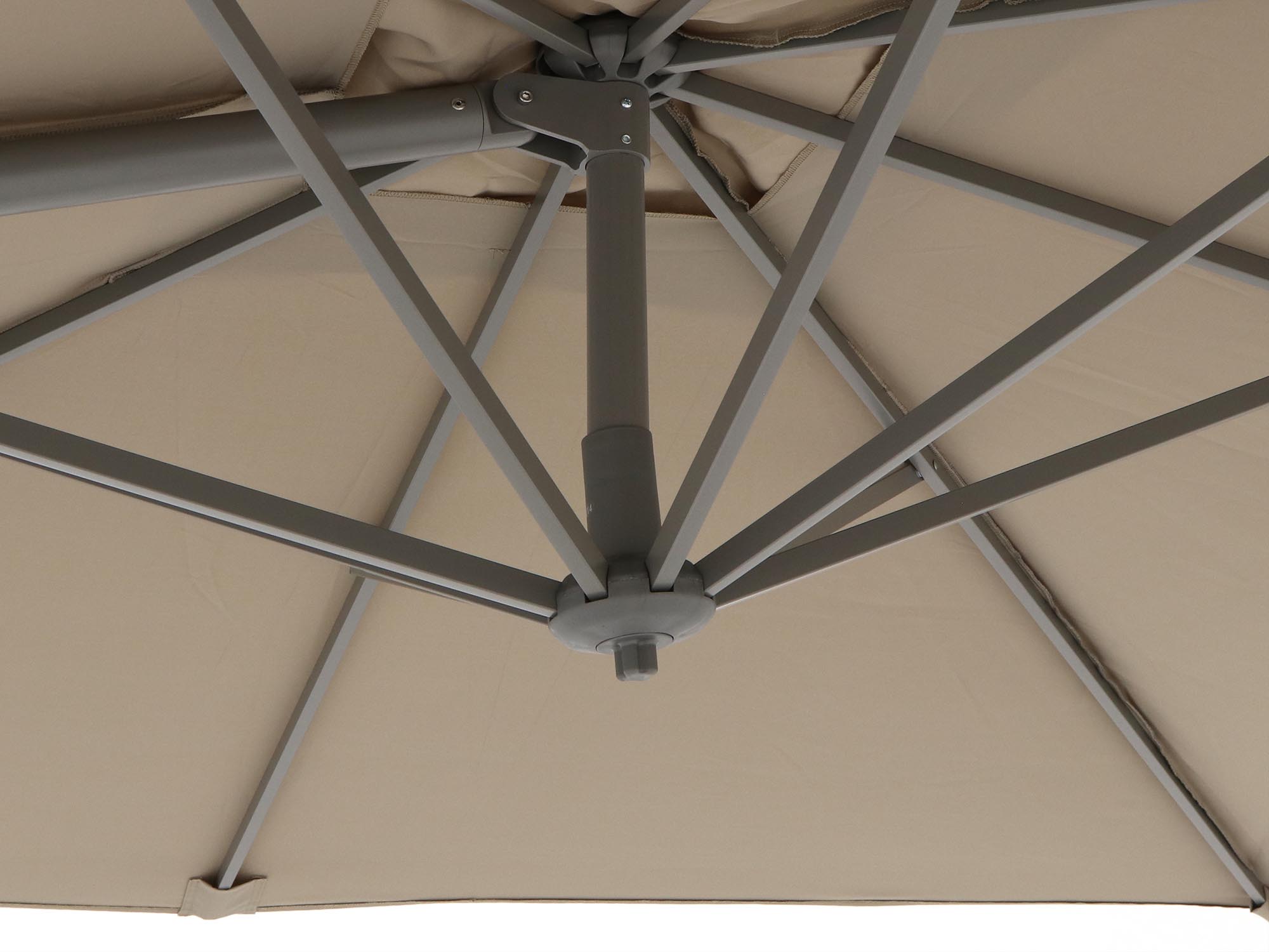 Dankzij de zwevende constructie zit er niks in de weg. Je hebt alle ruimte onder het doek, ideaal bij een eettafel of loungeset.