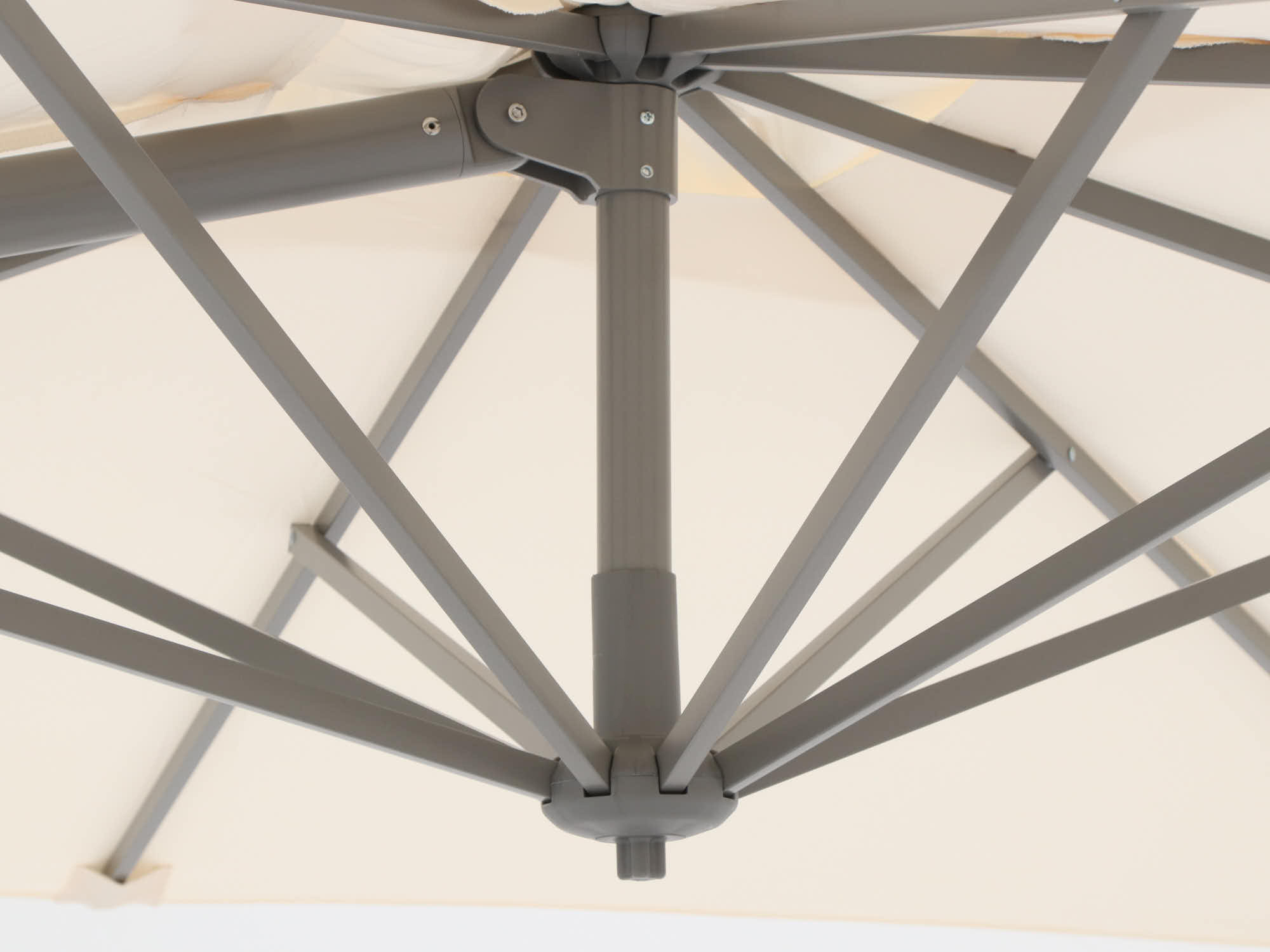 Dankzij de zwevende constructie zit er niks in de weg. Je hebt alle ruimte onder het doek, ideaal bij een eettafel of loungeset.