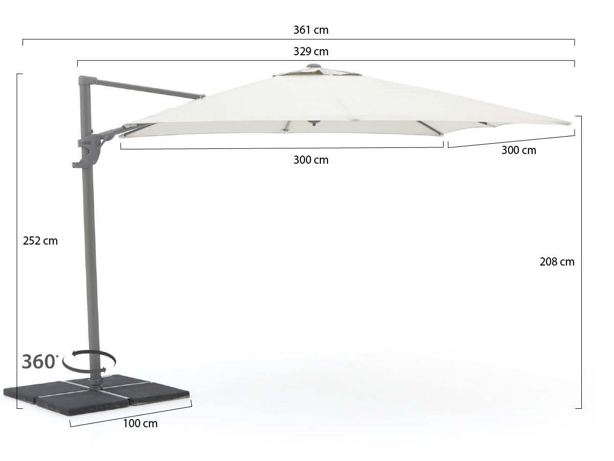 Het parasoldoek is van polyester en heeft een strakke afwerking. Het parasoldoek heeft de stofklasse 2 en de kleur Light Grey. De afmeting van het parasoldoek is 300 x 300 cm. Daarnaast is de Francisco parasol extra stevig door de flexibele baleinspanners. De Francisco zweefparasol wordt inclusief kruisvoet geleverd, echter worden de tegels niet meegeleverd. Wij adviseren 4 tegels (50 x 50 cm) van ± 25 KG per stuk te gebruiken.