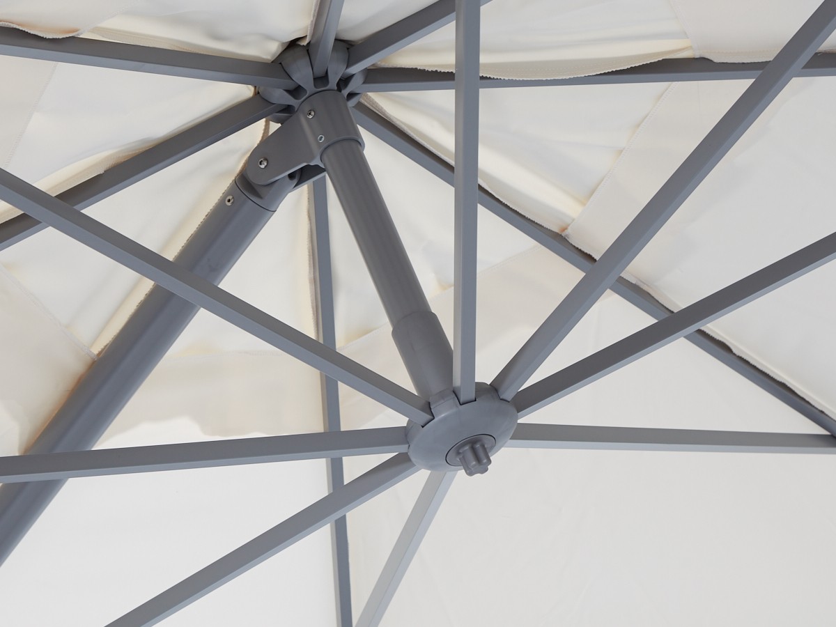 Dankzij de zwevende constructie zit er niks in de weg. Je hebt alle ruimte onder het doek, ideaal bij een eettafel of loungeset.