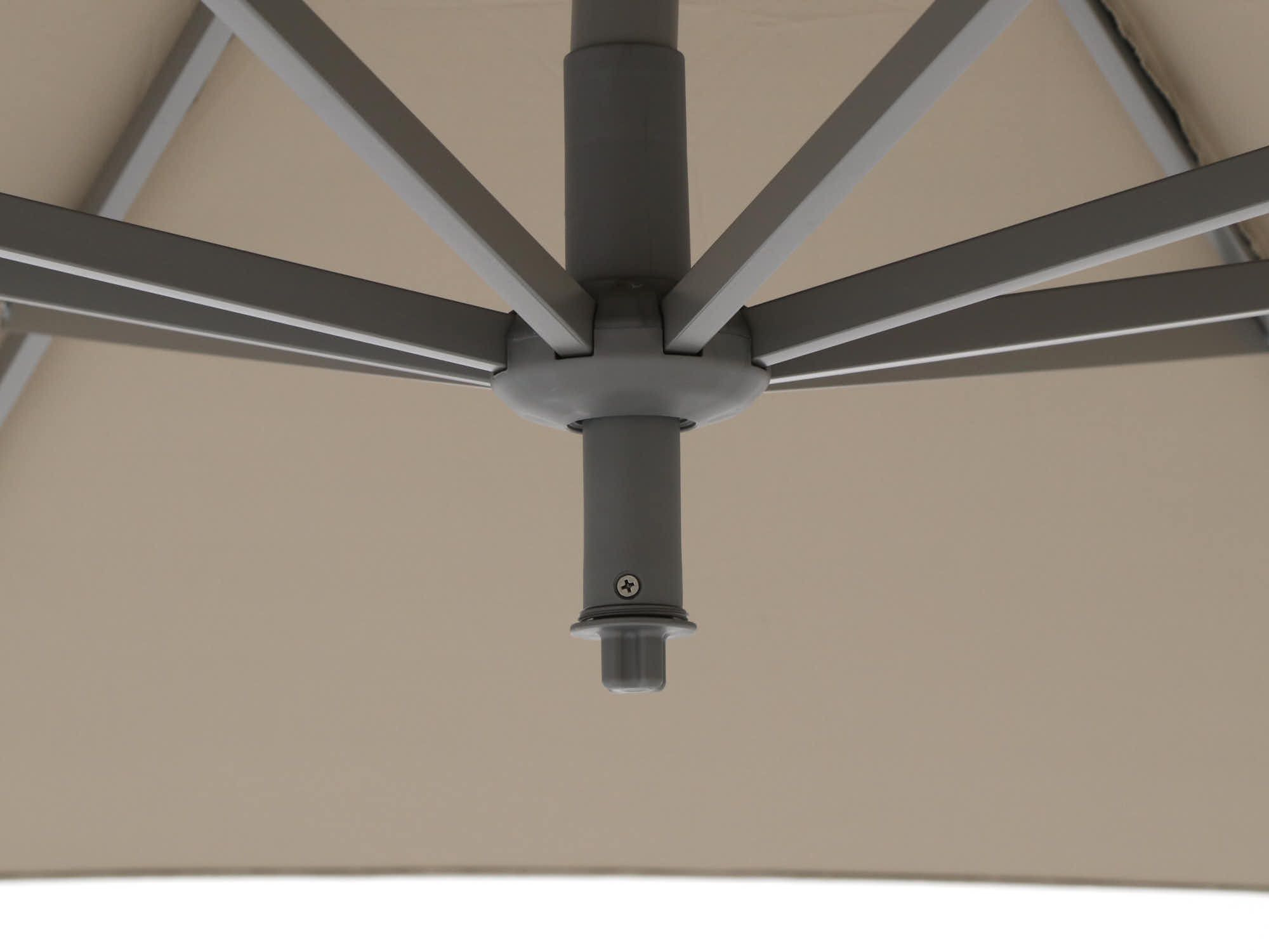 Dankzij de zwevende constructie zit er niks in de weg. Je hebt alle ruimte onder het doek, ideaal bij een eettafel of loungeset.