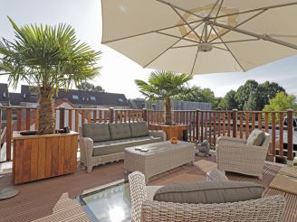 Dankzij de zwevende constructie zit er niks in de weg. Je hebt alle ruimte onder het doek, ideaal bij een eettafel of loungeset.