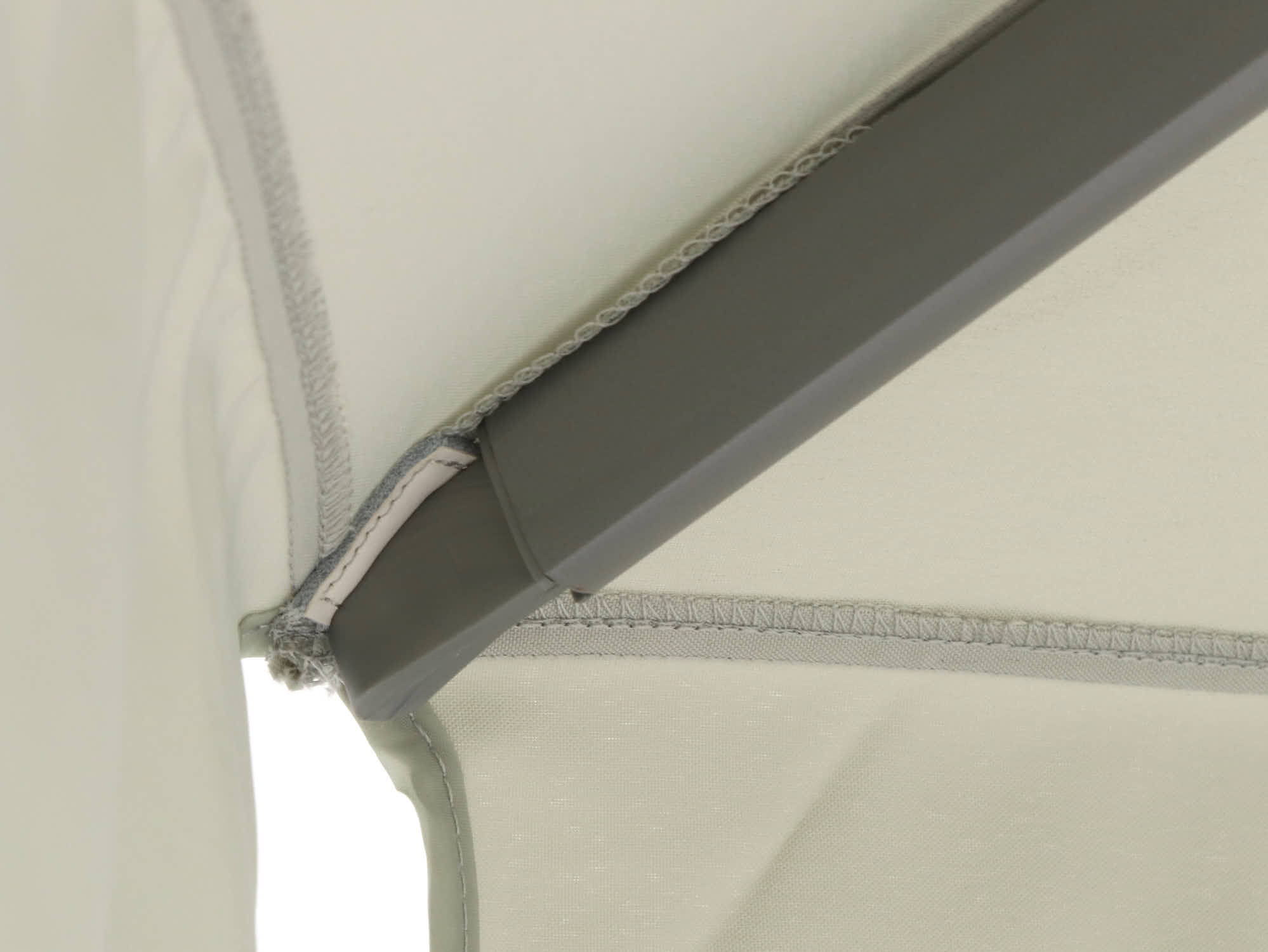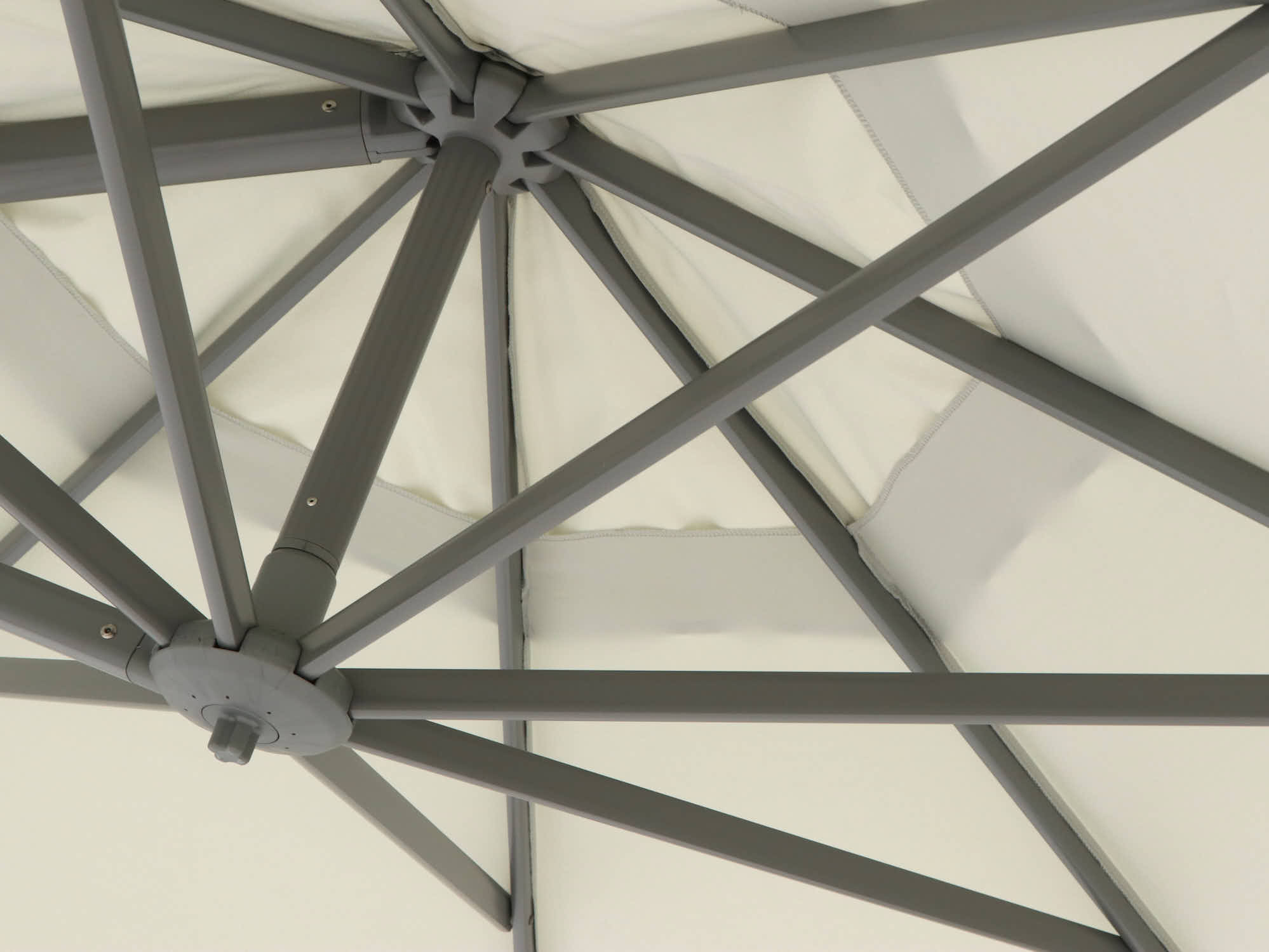 Dankzij de zwevende constructie zit er niks in de weg. Je hebt alle ruimte onder het doek, ideaal bij een eettafel of loungeset.