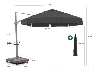 • Volledig draaibaar: Deze zweefparasol is 360 graden draaibaar, waardoor je hem eenvoudig meedraait met de zon. Zo geniet je de hele dag door van een koele plek.