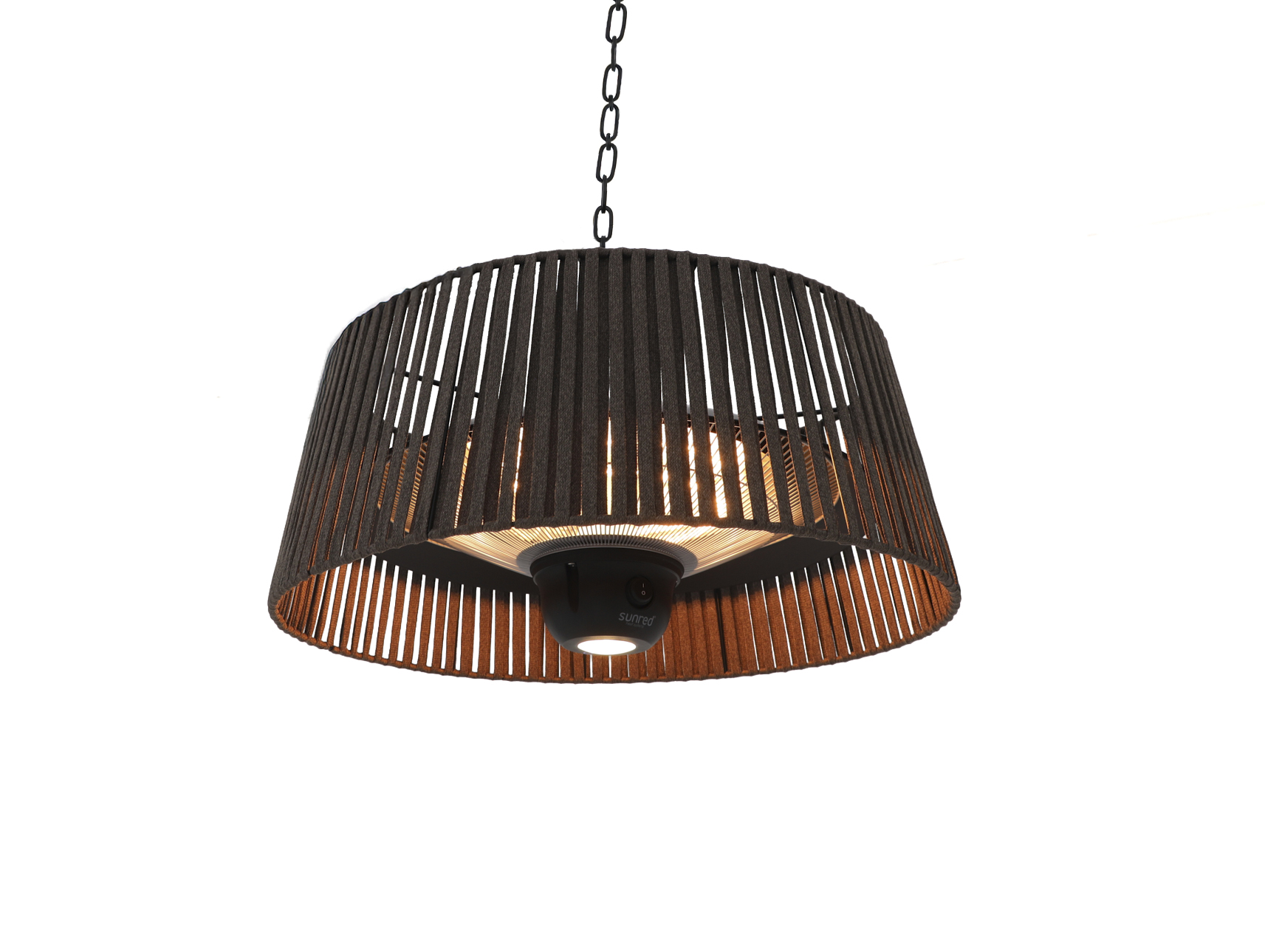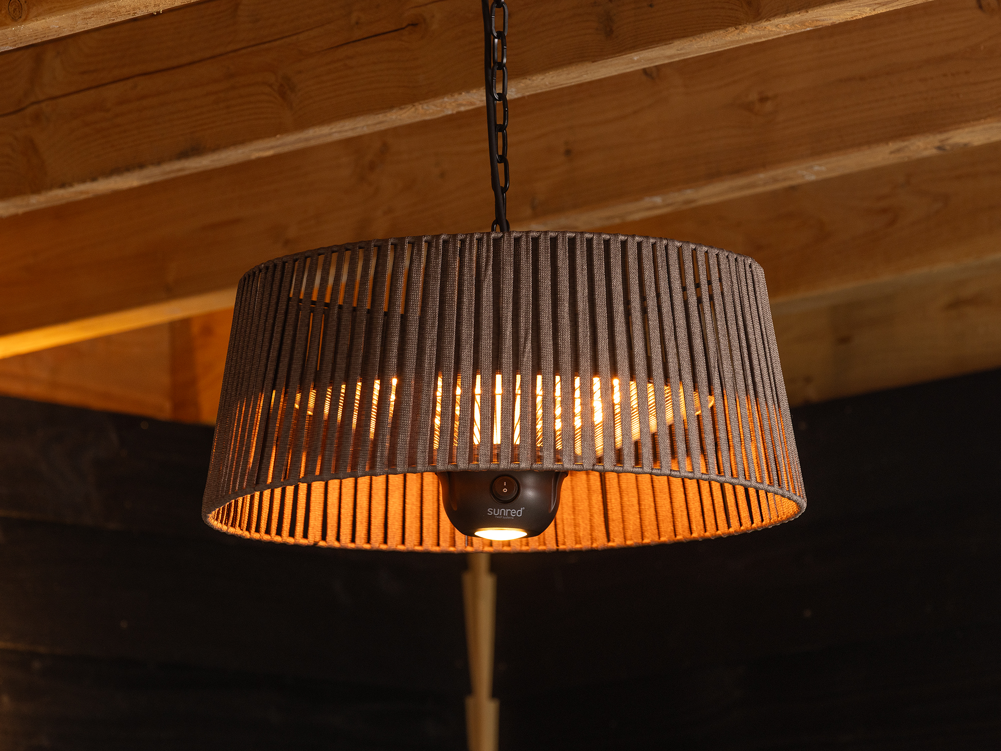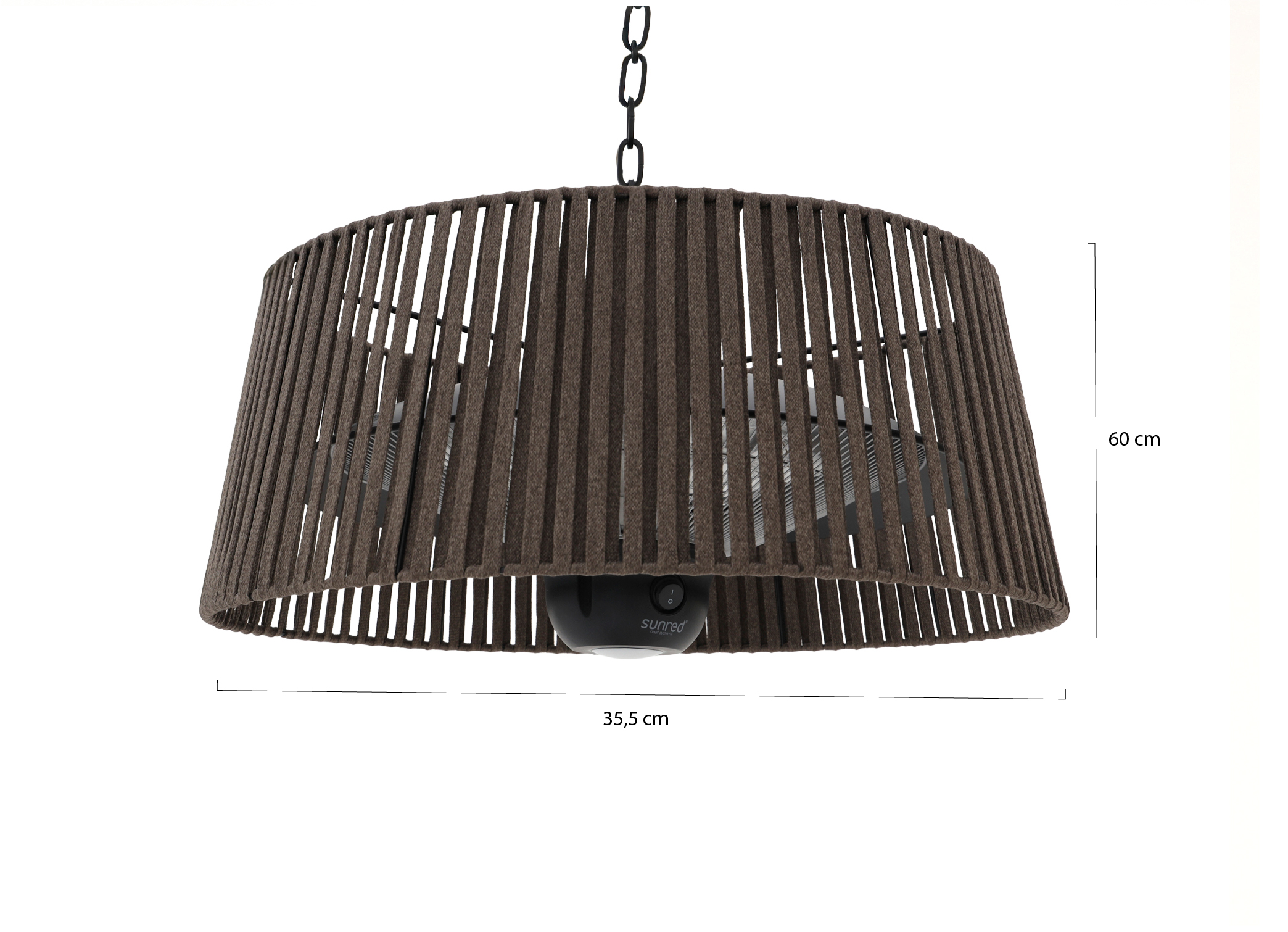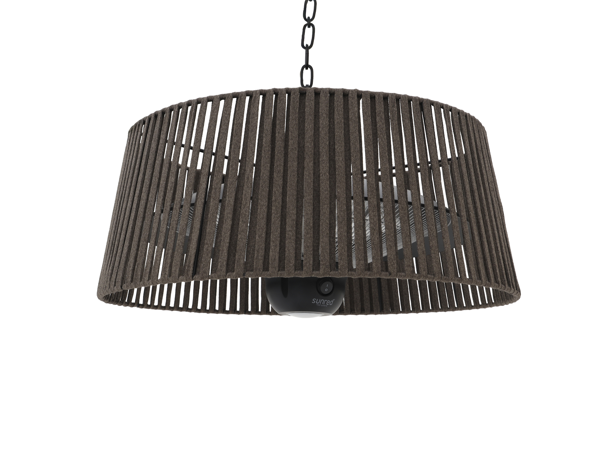De Sunred Bright Artix Corda in de kleur bruin is een stijlvolle hangende terrasverwarmer met een kap van olefin rope, een stevig touw van weerbestendige kunstvezel, en geïntegreerde LED‑verlichting. Het warme licht zorgt voor sfeer boven je tafel of loungebank, terwijl de infraroodtechniek werkt als zonnestralen, je voelt de warmte direct op je huid, ook als er wat wind staat, omdat niet de lucht maar jij en de spullen om je heen worden verwarmd. Handig voor onder een veranda, in een terrasoverkapping of op een beschut dakterras waar je een compacte, nette oplossing wilt die licht en warmte combineert.