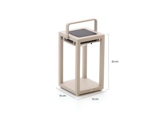 Zet deze lantaarn op tafel tijdens een avondborrel en je krijgt meteen warm, gezellig licht. Draadloos en compact, dus je schuift hem net zo makkelijk mee als de stoelen. Overdag laadt hij zichzelf op met de zon, en anders prik je de USB kabel erin. Binnen of buiten, het kan allebei; met IP65 kan hij gewoon buiten blijven staan, ook als het regent. De lichtbron zit er al in en je kiest zelf hoe fel hij schijnt. Uitgevoerd in Camel Sand. Met het formaat 16 x 16 x 26 cm past hij fijn op tafel of naast de loungeset.