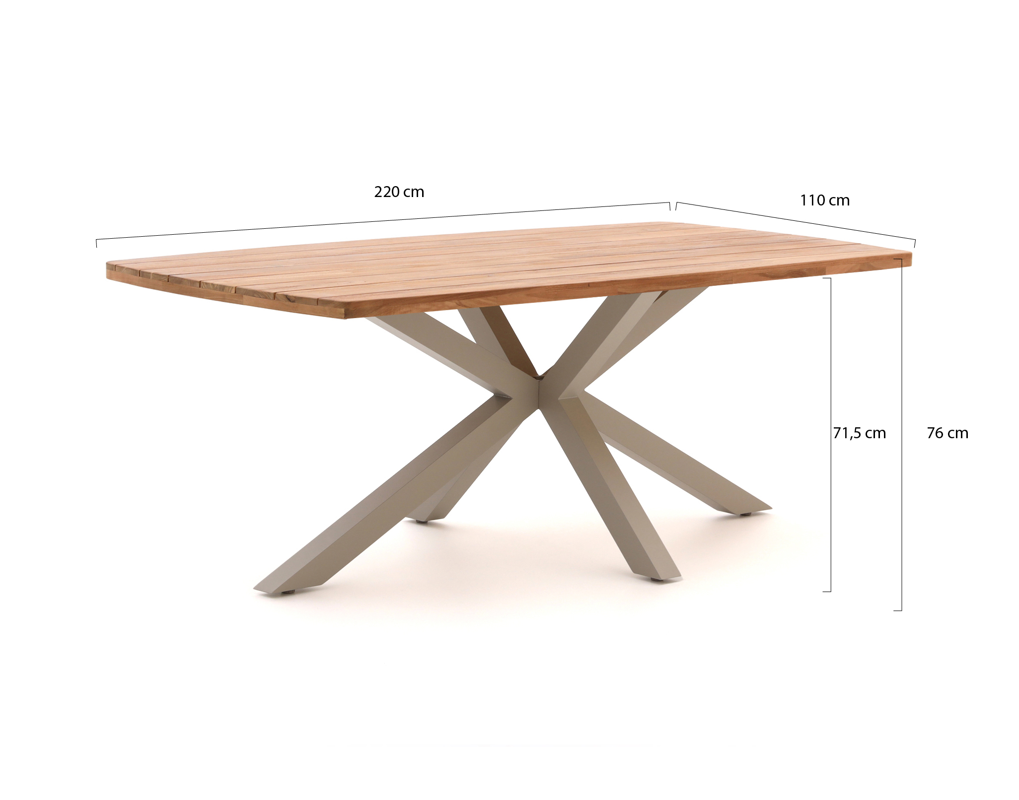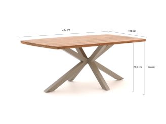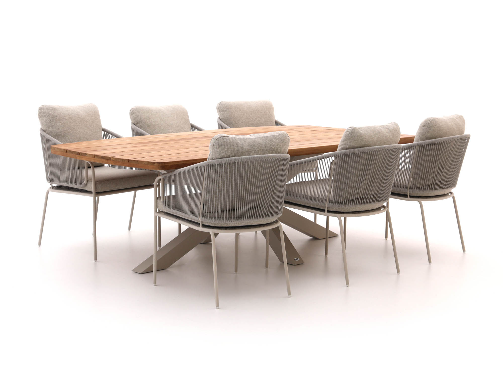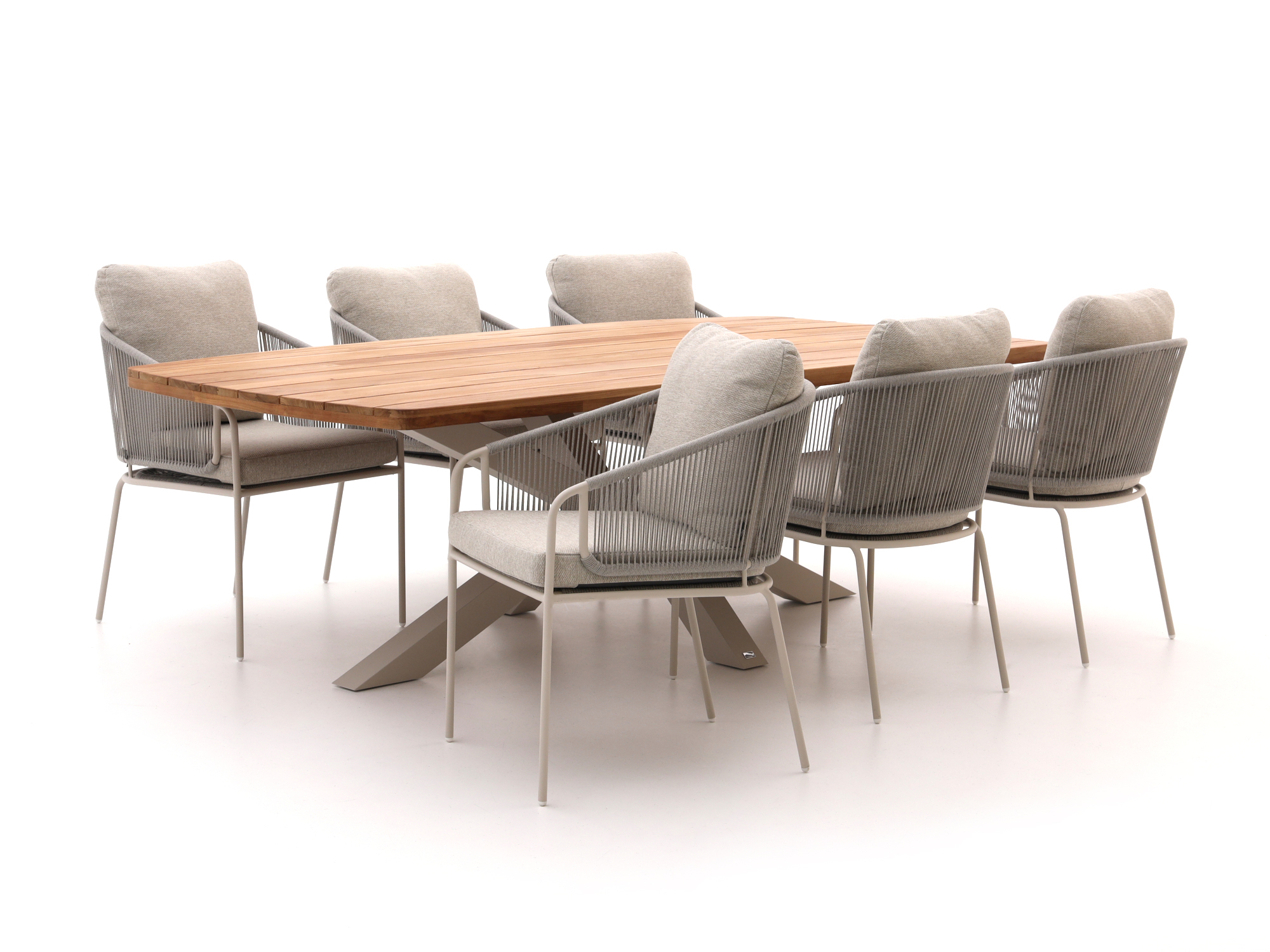 Stel je voor dat je met vrienden of familie geniet van een heerlijke maaltijd in de tuin, en dat allemaal aan deze SUNS Revello/Induno dining tuinset. Met een Deens ovaal teakhouten tafelblad en comfortabele stoelen in een warme beige kleur, is deze set een echte blikvanger. Het stevige stalen frame van de stoelen en het aluminium onderstel van de tafel zorgen ervoor dat je jarenlang plezier hebt van deze set. En ja, de kussens zijn inbegrepen, dus je hoeft alleen nog maar te zorgen voor lekker eten en goed gezelschap.