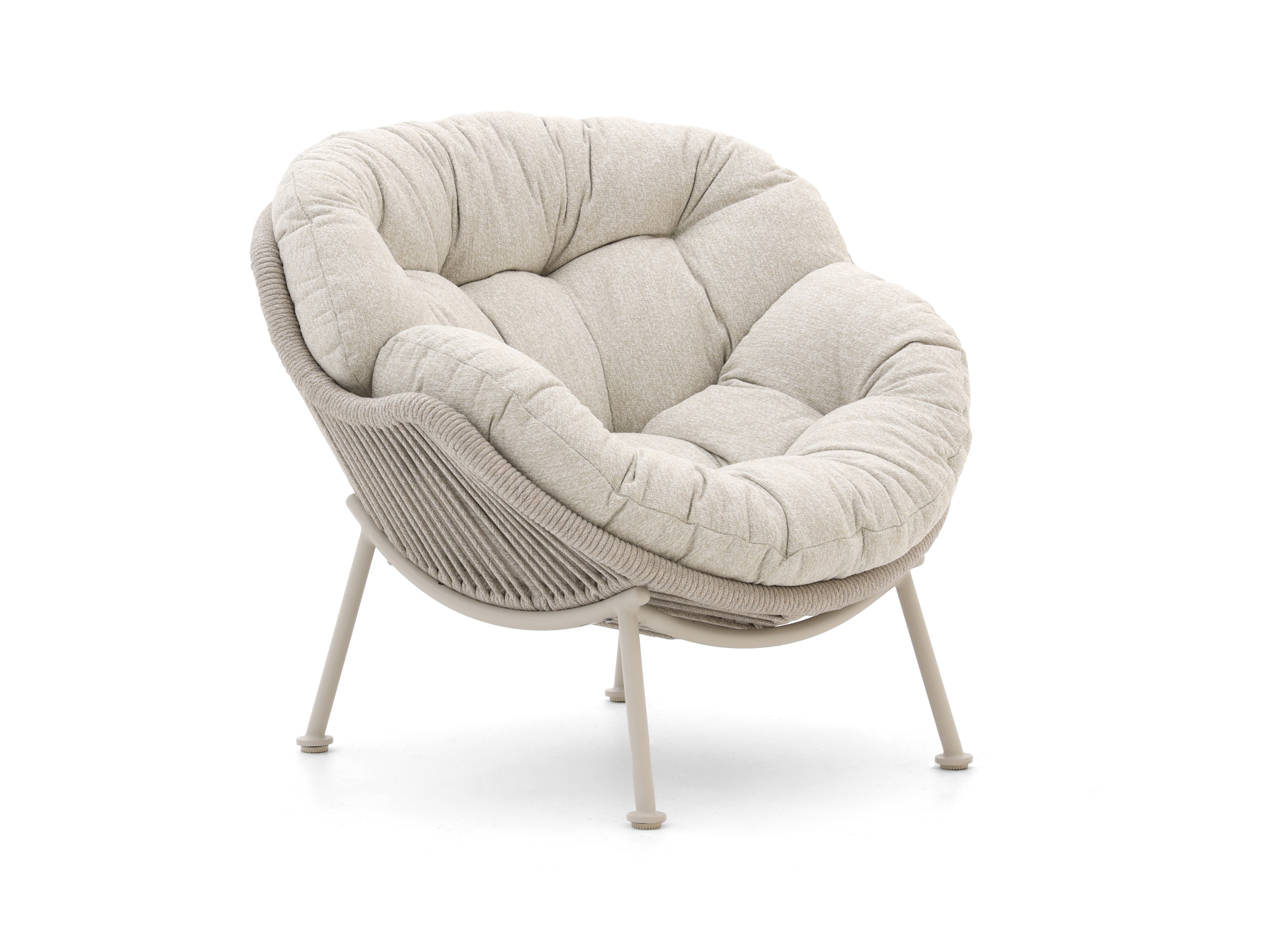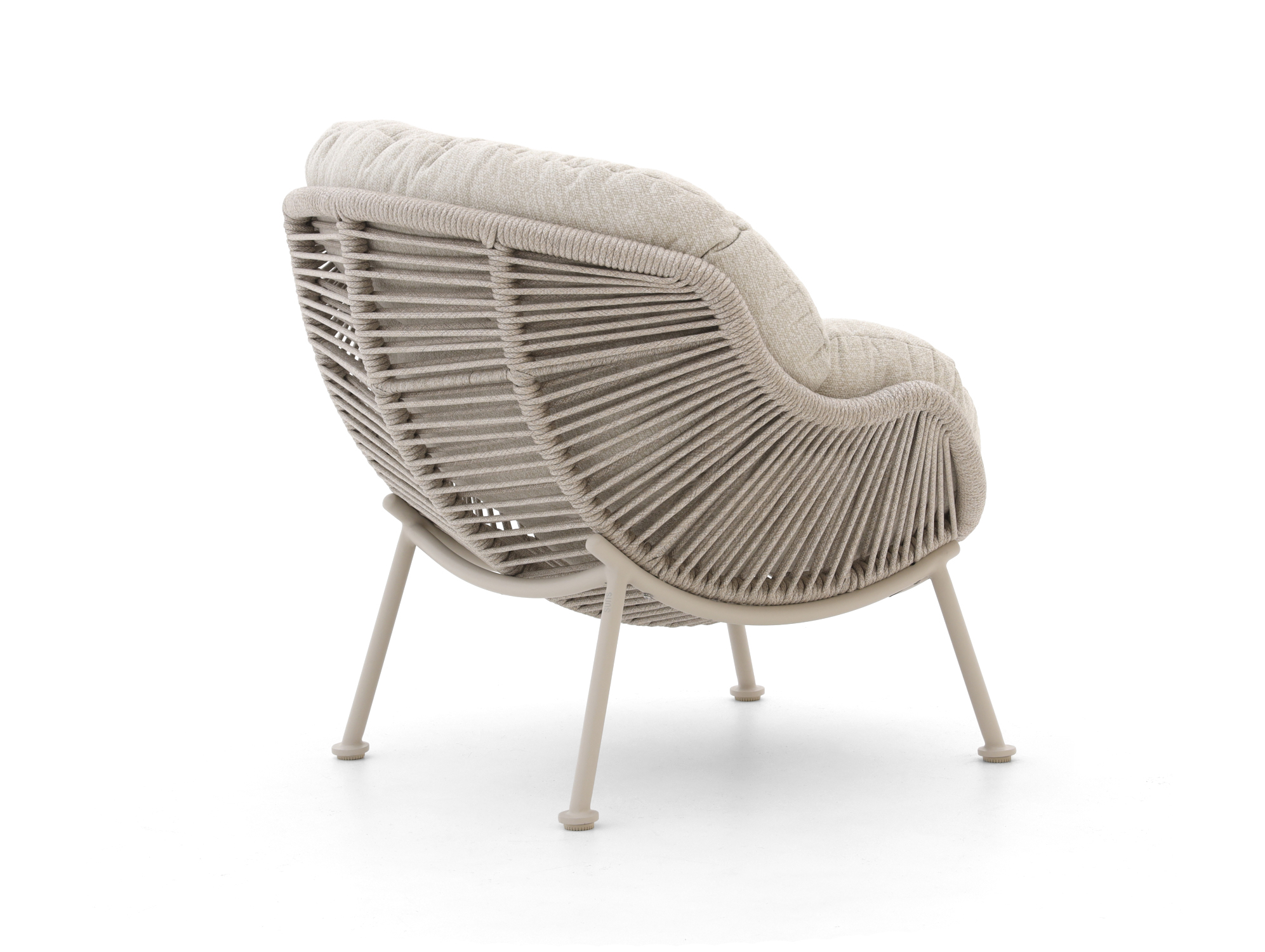 De SUNS Siano lounge tuinstoel beige is een loungestoel waarin je echt even onderuit kunt zakken, ideaal voor wie graag langer natafelt of met een boek in de tuin zit. De rugleuning staat net wat verder naar achter dan bij een diningstoel, waardoor je automatisch meer ontspant. Het aluminium frame is licht van gewicht, roest niet en heeft weinig onderhoud nodig, dus je schuift deze stoel makkelijk even opzij of naar een ander hoekje van je terras. De zitting en rug zijn van rope, dat snel opdroogt na een regenbui en niet warm wordt in de volle zon, waardoor je ook op warme dagen prettig blijft zitten. De inbegrepen kussens in zachte bouclé stof zorgen voor extra zitcomfort, vooral als je graag lang blijft hangen buiten.
