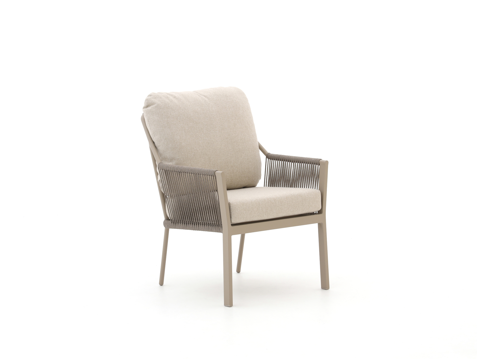 De Tierra Outdoor Liv low dining tuinstoel beige is een fijne stoel als je graag lang en ontspannen aan tafel zit. Je zit wat lager dan op een gewone diningstoel, waardoor het net tussen loungen en dineren in zit. Het aluminium frame is licht van gewicht, dus je tilt de stoel makkelijk even op als je je terras verschuift. De rope zitting vormt zich licht naar je lichaam en droogt snel op na een regenbui. De meegeleverde kussens zorgen voor extra zacht zitten, ideaal voor lange avonden buiten.