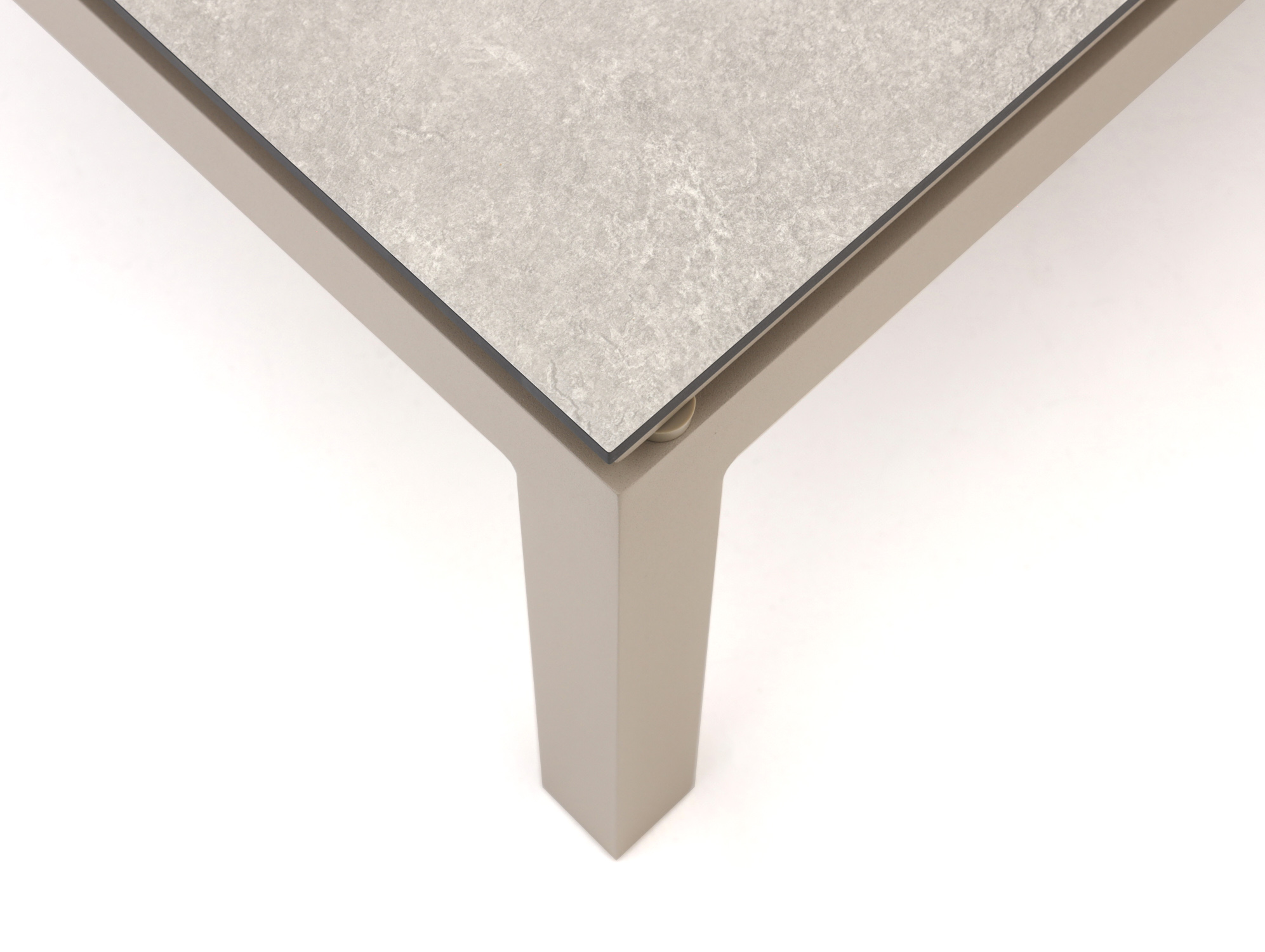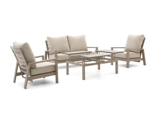 De Tierra Outdoor Musone/Flip-Up stoel-bank loungeset is een compacte 4 persoons loungeset met verstelbare rugleuningen, ideaal als je zowel wilt loungen als rechtop wilt zitten. Dankzij de stoel bank opstelling kun je de indeling makkelijk aanpassen aan je gezelschap, of je nu met zijn tweeën languit gaat of met vier personen een drankje doet. Het aluminium frame is licht van gewicht, waardoor je de onderdelen eenvoudig verschuift als je je terras anders wilt indelen of even wilt schoonmaken. De tafel heeft een kunststof blad in houtlook (HPL), dat water en vuil afstoot, zodat je hem na een borrelavond snel weer schoon hebt. De set wordt geleverd met bijpassende kussens in beige bruin tint, zodat je in één keer klaar bent om lekker te zitten.