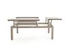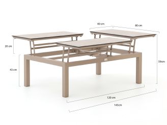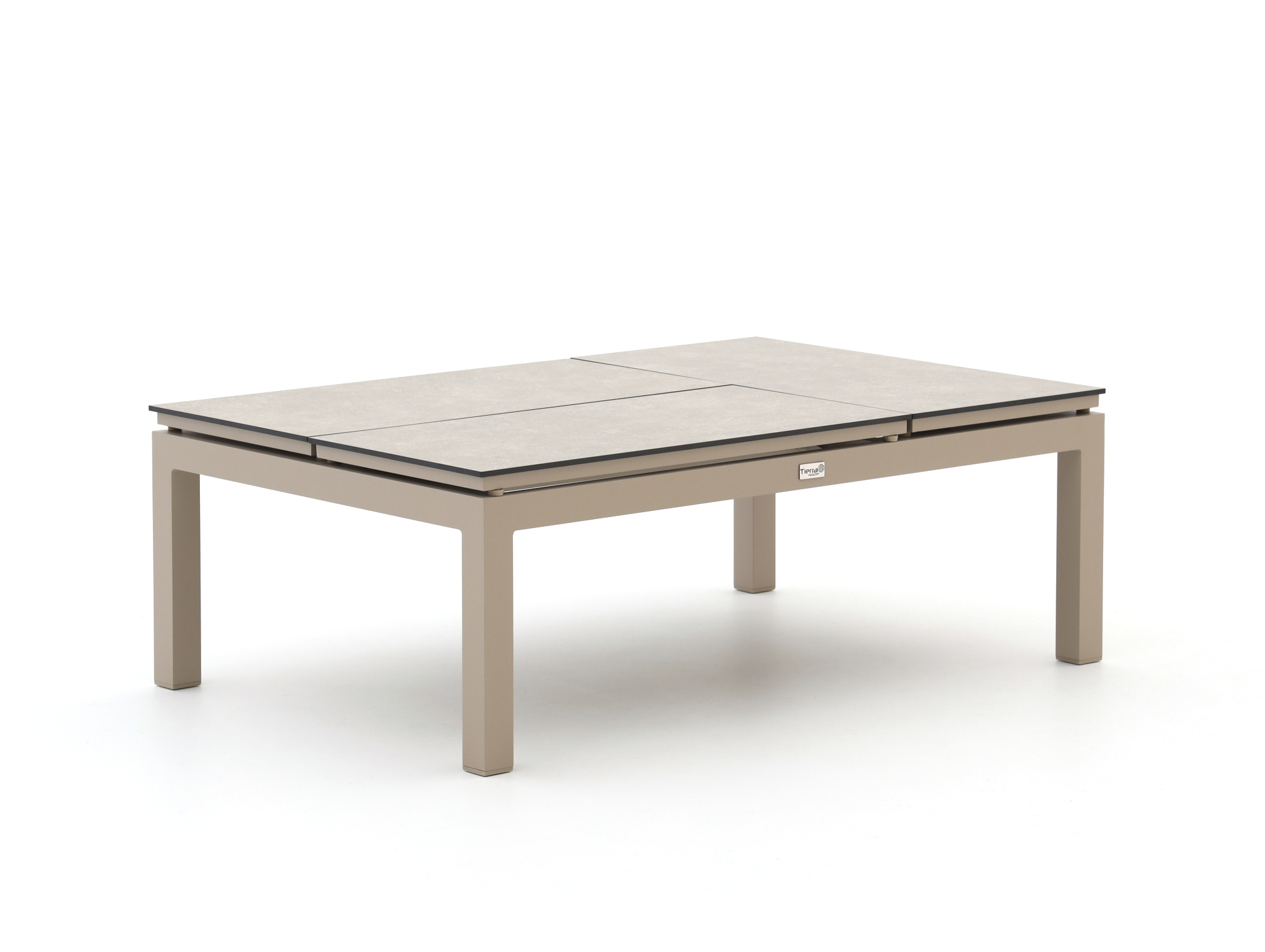 De Tierra Outdoor Oasis/Flip-Up stoel bank loungeset is een comfortabele set voor 5 personen, ideaal als je én lekker wilt loungen én af en toe aan tafel wilt zitten. De set bestaat uit een bank, stoelen en een rechthoekige tafel met kunststof blad, dus je kunt er net zo makkelijk een borrelplank als een stapel spelletjes op kwijt. Het aluminium frame is licht van gewicht, waardoor je de opstelling eenvoudig verandert naar hoe jij dat wilt. De bijgeleverde kussens in beige tinten maken dat je meteen kunt zitten zonder eerst passende kussens bij elkaar te hoeven zoeken. Handig als je gewoon naar buiten wilt lopen en direct wilt neerploffen.