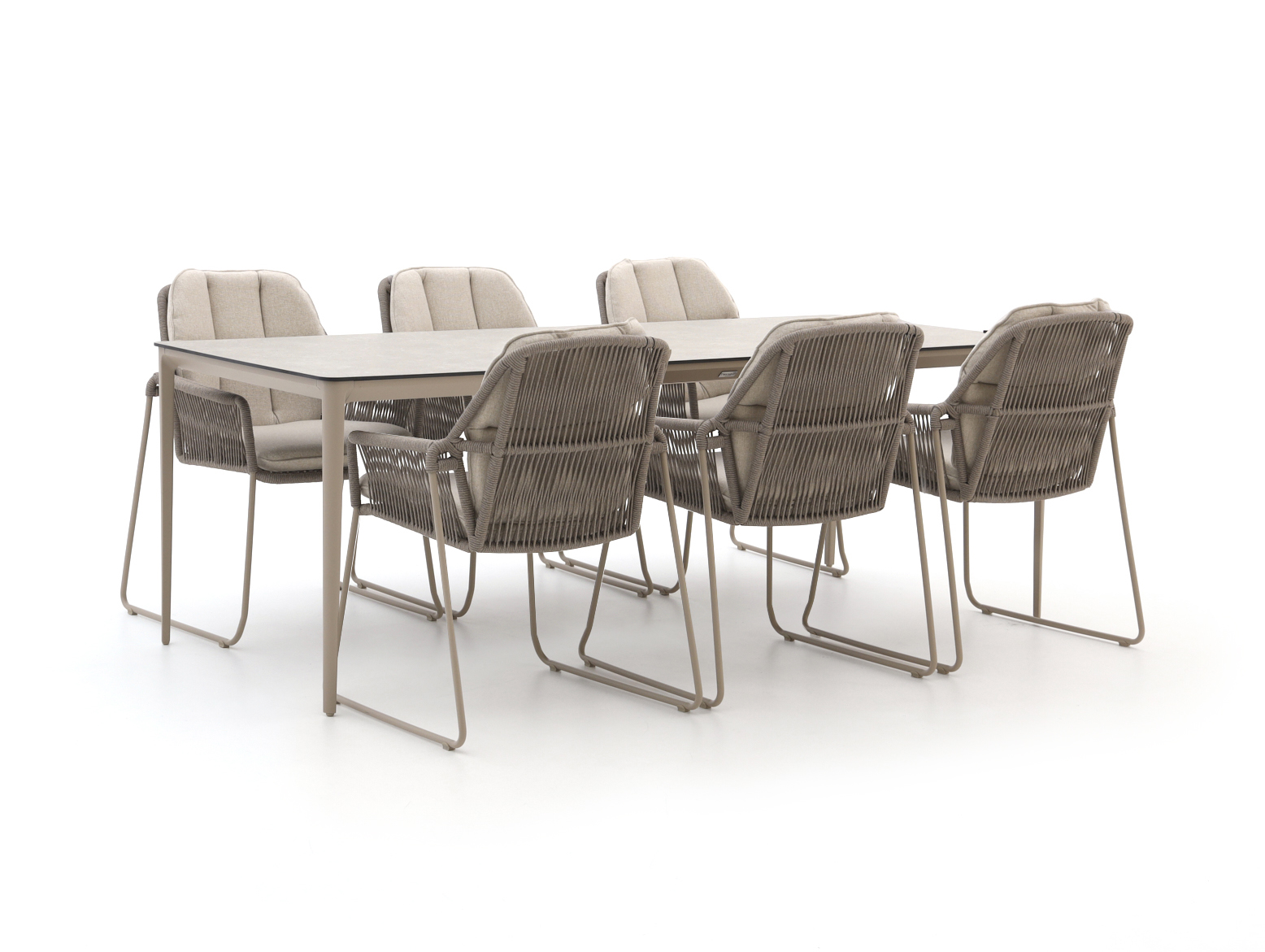 De Tierra Outdoor Rivera/Elegante dining tuinset is een ruime 6 persoons tuintafel met stoelen, ideaal als je graag met het hele gezin buiten eet of vrienden uitnodigt voor een barbecue. De set bestaat uit een lange rechthoekige tafel van 219 cm met aluminium onderstel en kunststof blad, en bijpassende stoelen in beige met kussens, zodat je comfortabel zit zonder dat je een extra kussenspeurtocht hoeft te houden. Aluminium is licht van gewicht, dus je schuift de tafel makkelijk een stukje opzij als je je terras anders wilt indelen. Het kunststof tafelblad is onderhoudsarm, waardoor je na het eten vooral je borden hoeft af te wassen, en niet je hele tuintafel. Zoek je een royale, praktische eettafelset om lekker aan te tafelen, dan zit je met deze Rivera/Elegante set goed.