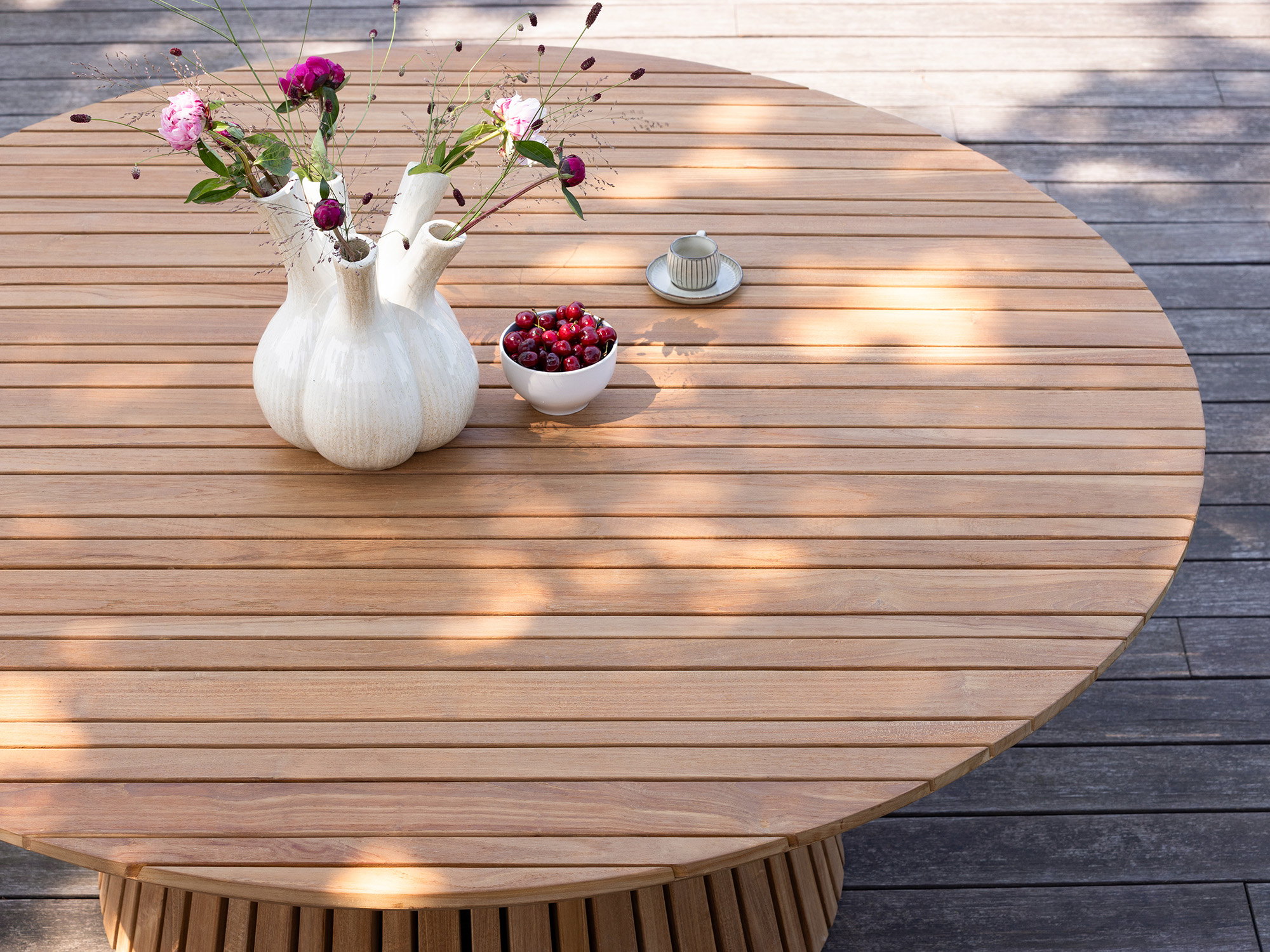 • Ronde teakhouten tafel van 150 cm: Iedereen zit dicht bij elkaar en kan elkaar goed zien, handig voor lange gesprekken en spelletjes.